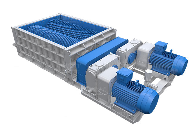 雙齒輥破碎機(jī)在工作時(shí),物料進(jìn)入破碎腔,通過(guò)高速旋轉(zhuǎn)兩齒輥對(duì)物料進(jìn)行剪切、擠壓、拉伸等作用對(duì)物料進(jìn)行破碎,齒輥中心距三擋可調(diào),保障出料粒度。