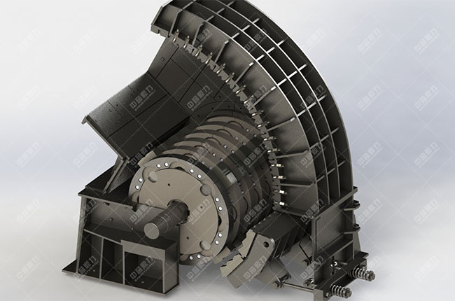 加工原料進(jìn)入碎石機(jī)中,遭獲得高速回轉(zhuǎn)的錘頭的沖擊而破碎,破碎了的加工原料,從錘頭處獲得動能,從高速沖向架體內(nèi)擋板,篩條,與此此時加工原料相互抨擊,遭到多次破碎,