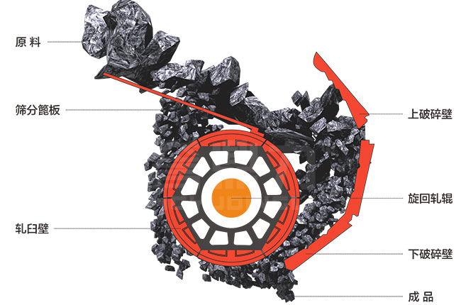 粗碎旋回破碎機(jī)主要由進(jìn)料斗總成、上破碎壁、下破碎壁、傳動(dòng)總成、旋回軋輥、篩分篦板、防護(hù)罩、機(jī)架、液壓調(diào)整及過(guò)載保護(hù)裝置組成。