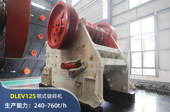DLEV125鄂式破碎機(jī)允許的進(jìn)料大小為800mm以內(nèi),排料口調(diào)整范圍為240-760mm,配備電機(jī)功率為160kw,生產(chǎn)能力可達(dá)760t/h。