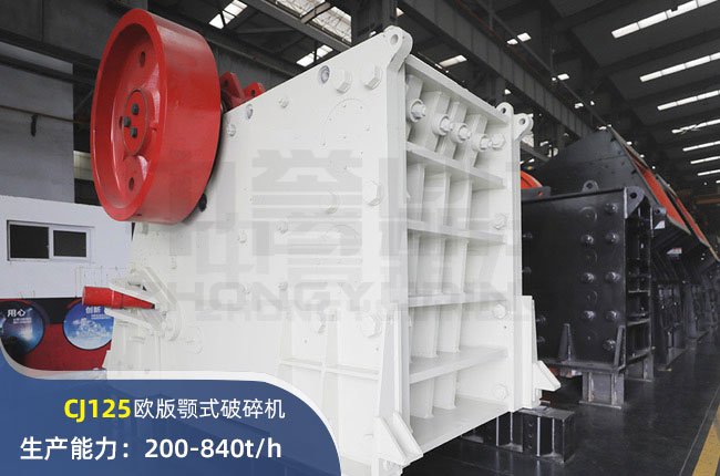 CJ125顎式破碎機進料口尺寸1250×950mm,進料粒度760mm,出料大小100-250mm,電機功率160kw,時產(chǎn)量可達840噸。