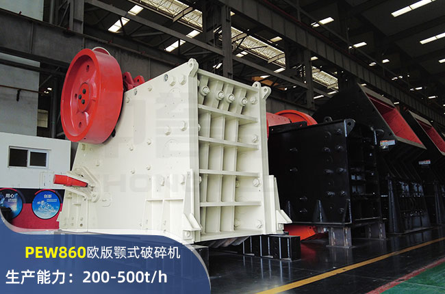 PEW860顎式破碎機(jī)進(jìn)料口尺寸860×1100mm,進(jìn)料粒度720mm,出料大小100-225mm,電機(jī)功率132kw,時產(chǎn)可達(dá)500噸左右。