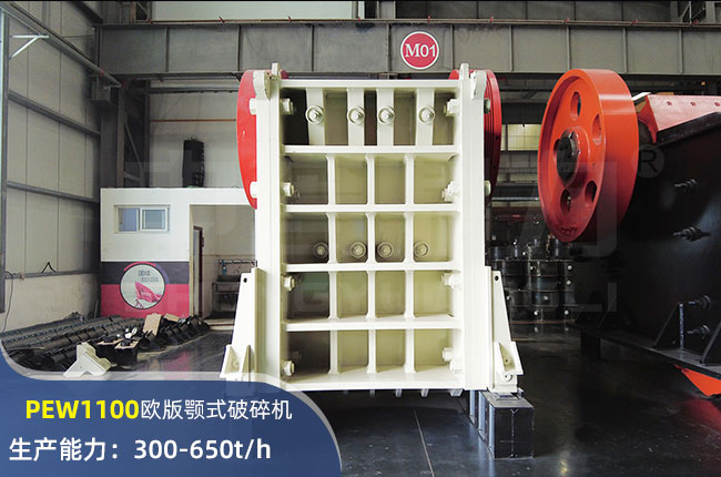 PEW1100顎式破碎機(jī)進(jìn)料口尺寸1100×1200mm,進(jìn)料粒度930mm,出料大小150-275mm,電機(jī)功率185kw,時(shí)產(chǎn)可達(dá)650噸左右。