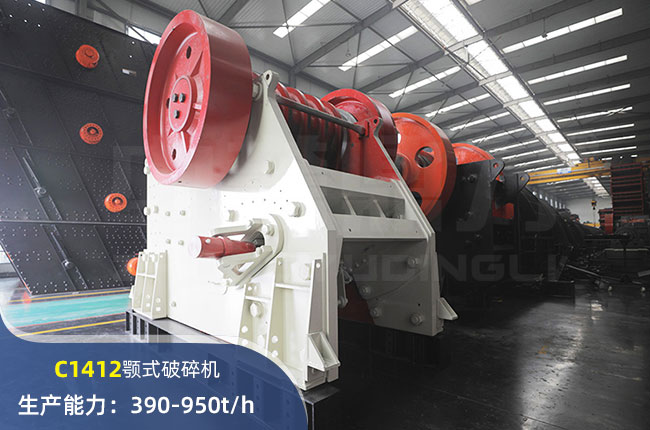 C1412顎式破碎機進料口尺寸1400×1200mm,進料粒度≤1200mm,出料大小≤95mm,電機功率185kw,時產(chǎn)在390-950噸左右。