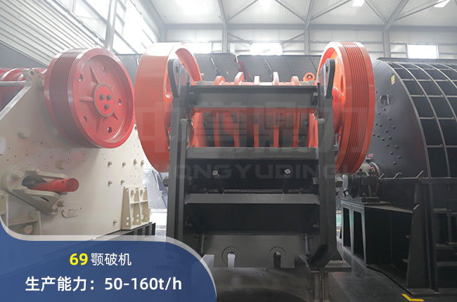 69破碎機(jī)每小時(shí)產(chǎn)量在50-160噸,進(jìn)料尺寸要求≤500mm,出料粒度65-160mm可調(diào)節(jié),多用在碎石生產(chǎn)線粗碎階段。