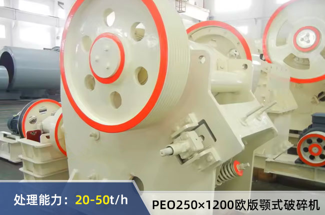 PEO250×1200歐版顎式破碎機(jī)進(jìn)料粒度≤220mm,排料口調(diào)節(jié)范圍20-40mm,時產(chǎn)量20-50噸,配的是37kw電機(jī),外型長寬高尺寸為1400×2050×1310mm,重量為6噸。