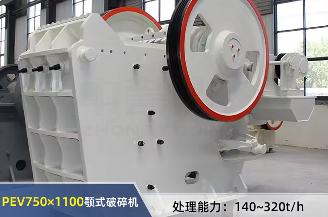 750×1100破碎機指PEV750×1100顎式破碎機,進料口允許通過不大于640mm的物料,排料口調整范圍在80-190mm之間,一小時產量可達到140-320噸,所配置的電機功率為90-110千瓦,外形尺寸長寬高分別是3750mm,2580mm,3180mm,重量約26噸左右。