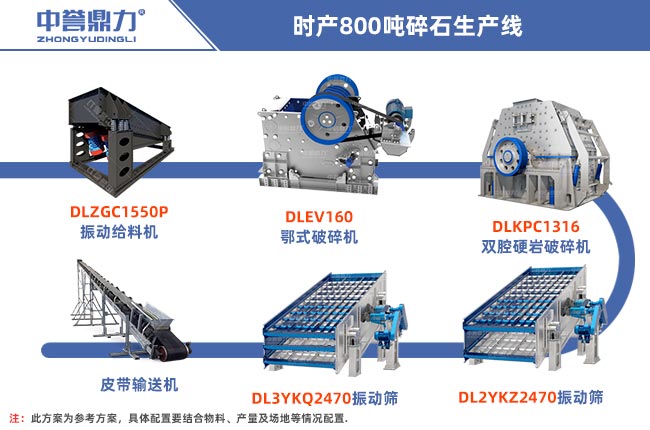設(shè)備配置方案:DLZGC1550P振動給料機、DLEV160顎式破碎機、DLKPC1316雙腔硬巖破、DL2YKZ2470振動篩、3YKQ2470振動篩、輸送機。