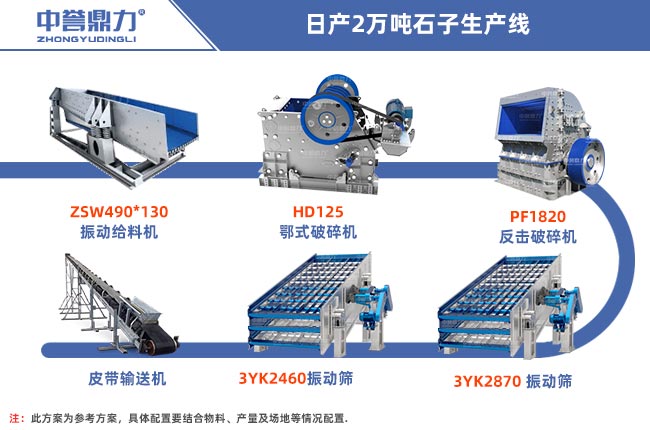 配置一條日產(chǎn)2萬噸石子生產(chǎn)線需要用到給料設(shè)備、破碎設(shè)備、輸送設(shè)備以及篩分設(shè)備等配套設(shè)備,根據(jù)客戶不同硬度的物料,可以分多種配置方法,如下所示: