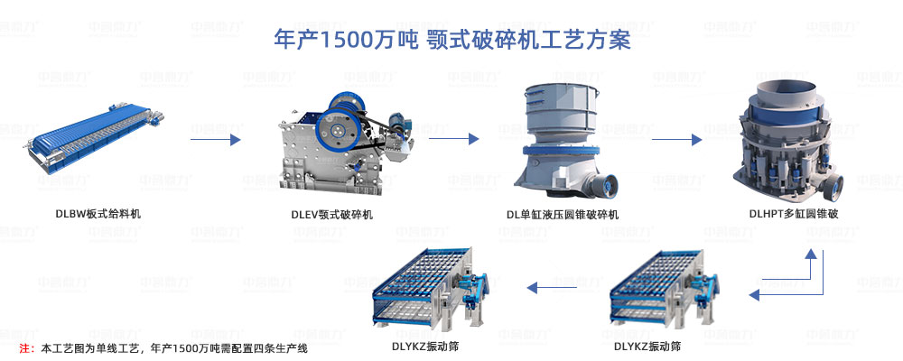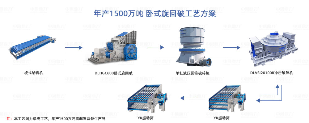 年產1500萬噸產能較大,折合成時產量,大概每小時要產4000-5000噸,結合各種碎石設備的產能,有如下幾種設備配置方案: