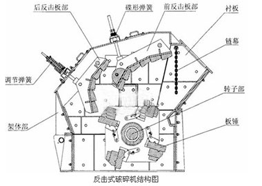 工作原理:先由反擊式破碎機(jī)電動(dòng)機(jī)通過三角膠帶驅(qū)動(dòng)轉(zhuǎn)子作旋轉(zhuǎn)運(yùn)動(dòng)。這時(shí),轉(zhuǎn)子上的板錘在離心力作用下呈放射狀態(tài)。當(dāng)物料由入料口進(jìn)入板錘旋轉(zhuǎn)的范圍內(nèi)后,便受到高速運(yùn)轉(zhuǎn)板錘沖擊,并沿著板錘旋轉(zhuǎn)的切線方向拋向反擊板進(jìn)行撞擊。然后,又從反擊板返回到板錘旋轉(zhuǎn)空間,進(jìn)入反擊板的沖擊區(qū)。物料受到板錘,反擊板的反復(fù)沖擊和在破碎腔內(nèi)的撞擊便不斷地沿著本身的節(jié)理節(jié)面產(chǎn)生裂縫,內(nèi)部組織受到破壞,松解而碎裂。小于破碎要求的顆粒,便順著板錘與反擊板間隙排出機(jī)外,即成為破碎后的產(chǎn)品。
