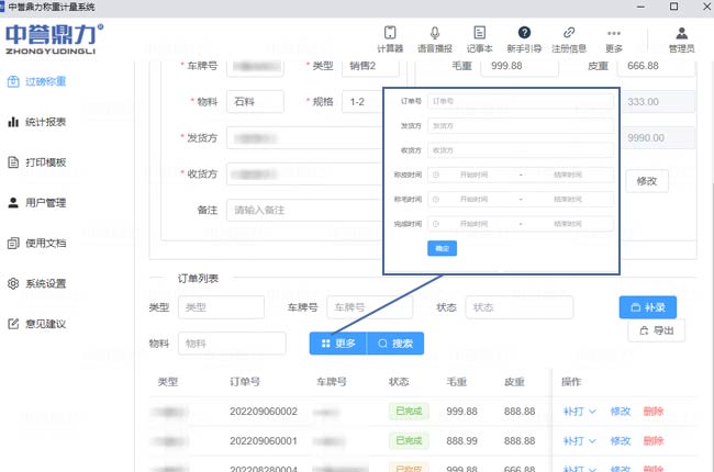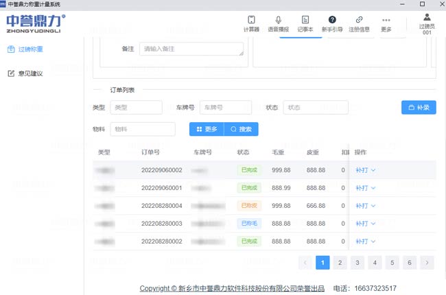 登錄賬號(hào),過磅稱重界面根據(jù)需求可按照類型、車牌號(hào)、狀態(tài)、物料、時(shí)間等篩選數(shù)據(jù)?筛鶕(jù)需求調(diào)出過磅記錄。