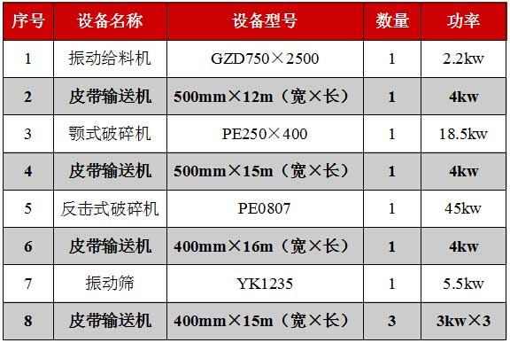 由震動喂料(GZD750×2500)、鄂破機(PE250×400)、pf反擊破(PF0807)、篩石子機(YK1235)、傳送設備(400毫米寬X16m長)等機械組成;布置處理量通常為20-30噸/小時。
