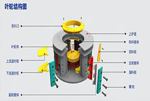 物料由機(jī)器上部垂直進(jìn)入高速旋轉(zhuǎn)的葉輪內(nèi),在高速離心力的作用下,和另一部分以傘形式分流在葉輪四周的物料產(chǎn)生高速撞擊與粉碎,物料在撞擊后,又會(huì)在葉輪和機(jī)殼之間以物料形成渦流多次之間而粉碎,達(dá)到粉碎要求會(huì)從下部排出。