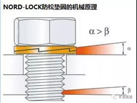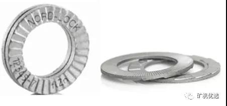 該防松墊圈由兩片墊片組成,外側(cè)是帶有放射狀凸紋面,內(nèi)側(cè)為斜齒面。當(dāng)裝配時(shí),內(nèi)側(cè)斜齒面間相對(duì),外側(cè)放射狀凸紋面與兩端接觸面成咬合狀態(tài)。當(dāng)連接件受到振動(dòng),并使螺栓發(fā)送松動(dòng)趨勢(shì)時(shí),僅僅允許兩片墊圈內(nèi)側(cè)斜齒面間相對(duì)錯(cuò)動(dòng),產(chǎn)生抬升張力,從而達(dá)到100%的鎖緊效果。