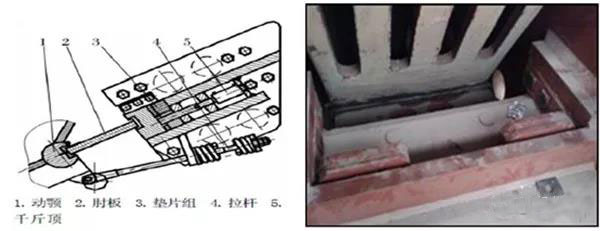 顎板的大小,中間一塊較小,上下兩塊較大,上面也有一個(gè)楔形的東西,叫做固定楔塊或固定壓鐵。顎板靠螺栓固定在中間一塊顎板和壓鐵上。