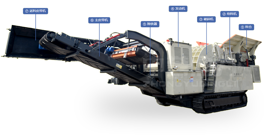 ⑦返料皮帶機(jī)將篩分履帶站的頭層物料輸送到破碎機(jī)