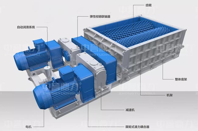 中譽(yù)鼎力雙齒輥式破碎機(jī)組成部分包括電機(jī)、自動(dòng)潤(rùn)滑系統(tǒng)、彈性柱銷聯(lián)軸器、齒輥、整體底架、機(jī)架、減速機(jī)、限矩式液力耦合器組成。