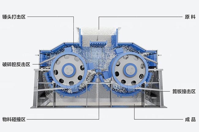 兩個(gè)轉(zhuǎn)子相對(duì)運(yùn)轉(zhuǎn),促使破碎腔內(nèi)物料相互撞擊,形成石料自粉碎,減少錘頭及部件的磨損和消耗。