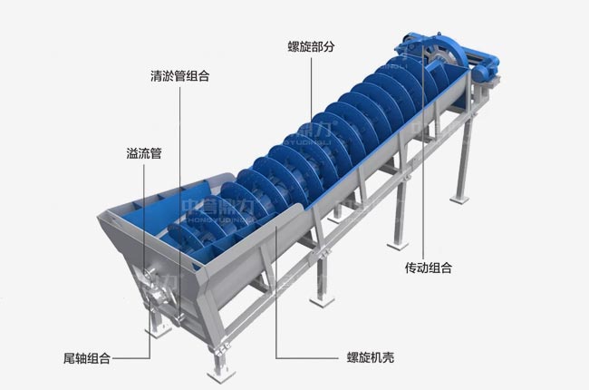 中譽鼎力螺旋洗砂機的結構組成包括尾軸組合、螺旋機殼、傳動組合、螺旋部分、清淤管組合、溢流管。