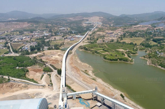 4、半成品混合料通過兩公里長(zhǎng)的皮帶長(zhǎng)廊輸送到省道旁邊的篩分銷售區(qū)域,山下篩分銷售。