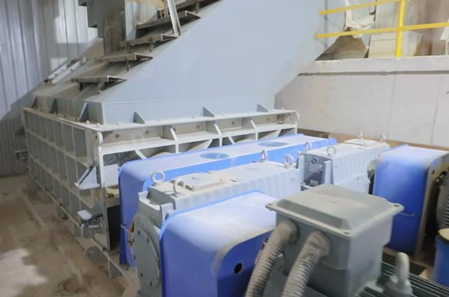 生產(chǎn)高鈣石共用鄂破破碎,然后進入中轉(zhuǎn)倉,棒條篩預(yù)篩分,篩分出50-80、31.5-50、31.5以下需要整形進入雙齒輥破碎機,不需要整形直接進入二級篩分出4種成品;