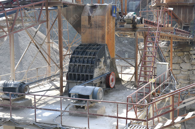 石灰石原料通過(guò)料倉(cāng)由喂料機(jī)將石料均勻的送進(jìn)重錘破進(jìn)行粗碎,粗碎后的石料在通過(guò)整形破進(jìn)行進(jìn)一步破碎,后由振動(dòng)篩進(jìn)行篩分,篩分出的滿(mǎn)足要求的石子,會(huì)被送往成品料堆,不滿(mǎn)足要求的石子,會(huì)返回整形破進(jìn)行再次破碎。