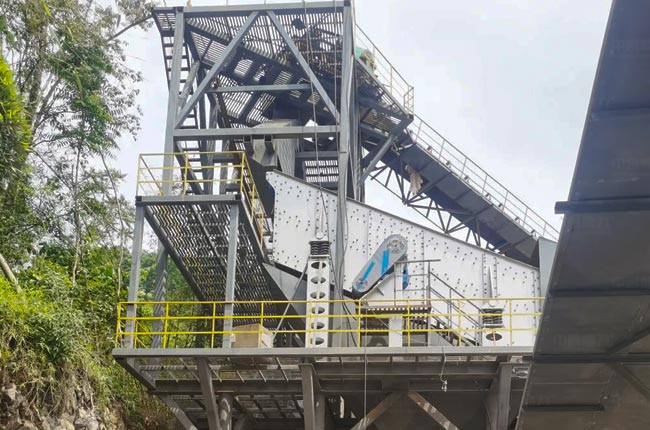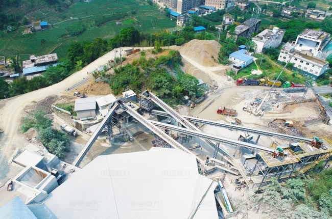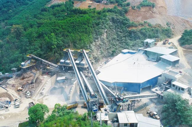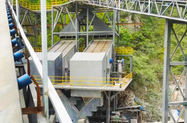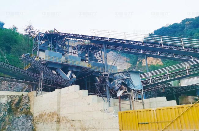 該項(xiàng)目外購原石料由轉(zhuǎn)載機(jī)送入料斗至DLZGC1550P給料機(jī)進(jìn)入DLPCZ1815破碎機(jī)進(jìn)行破碎,再由輸送帶送至DLPCZ1622整形破碎機(jī)進(jìn)一步破碎,細(xì)碎后的石料由輸送帶送進(jìn)振動(dòng)篩或中轉(zhuǎn)倉,通過振動(dòng)篩分后,篩出的40-80mm石料進(jìn)入成品倉儲(chǔ)存,0-5mm石料進(jìn)入洗砂機(jī)進(jìn)行洗砂脫水,其余碎石由輸送帶送入振動(dòng)篩進(jìn)行二次篩分,篩出的40-80mm石料進(jìn)入制砂機(jī)、沖擊破進(jìn)一步破碎后返回振動(dòng)篩進(jìn)行篩分,二次篩分后得到0-5mm、5-10mm、10-40mm的石料,其中10-40mm的石料進(jìn)入篩分機(jī)進(jìn)行三次篩分,得到10-20mm、20-40mm的石料直接進(jìn)入成品倉。