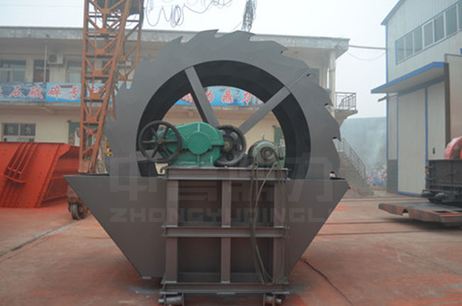 工作時,在電機的帶動下三角帶、減速機、齒輪減速后帶動葉輪進行轉(zhuǎn)動,石粉物料由給料槽進入洗槽中,在葉輪帶動下翻滾,等除去石粉表面雜質(zhì)后完成清洗,從溢出口洗槽排出。干凈的石粉由葉片帶走,然后砂石從旋轉(zhuǎn)的葉輪倒入出料槽。