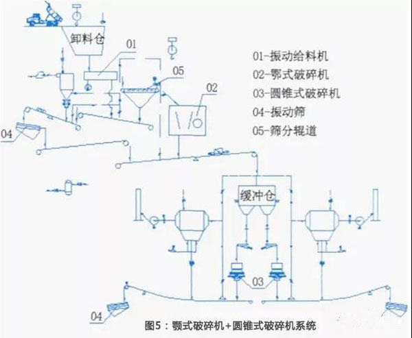 由顎式破碎機、圓錐式破碎機和篩分系統(tǒng)組成,見圖5。