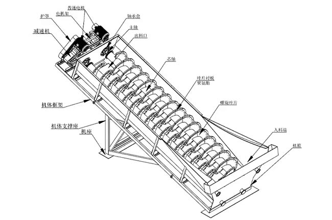 雙螺旋洗沙機(jī)組成結(jié)構(gòu)包含支架、槽體、電機(jī)、減速機(jī)、中心軸、螺旋葉片等組成。
