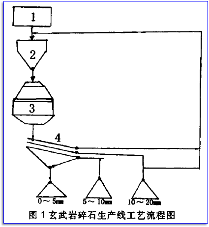玄武巖碎石生產(chǎn)線的技術規(guī)程,依據(jù)市場所形地貌以及生產(chǎn)技術而定,如圖1。