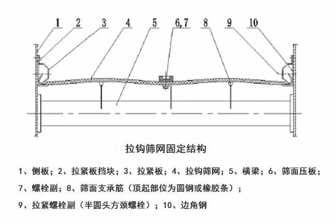 處理方法:對振動篩篩面支撐筋進行改進,增加篩網(wǎng)中間支撐筋的數(shù)量(由3根增加到5根),并且每根都與中間那根一致,具備安裝固定螺栓功能,通過多塊壓板壓緊,篩網(wǎng)固定,無法達(dá)到共振。