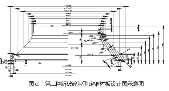 我們生產線設計小組用了半個月的時間設了三種新粉碎腔型(如圖b 所示,詳細數(shù)值見表c)。三種粉碎腔型相應的不變襯板及動錐襯板的圖紙設計完畢后,立即投入了生產解決,并在三套新備件回來后,我們在連續(xù)三個襯板的采用周內,分別在平均莫氏硬度f=12 的鐵巖石整型破碎生產中試用了這三種腔型,在生產平均莫氏硬度f=12 的鐵巖石整型破碎生產時,由于粉碎腔型中平行粉碎帶斜長的增加,整型破碎效果越來越好,但過分增加,勢會引起整型破碎加工能力的指標要求。結合三種新式腔的采用效果,我們終采用了種型腔,與它相連的不變襯板及動錐襯板的效果圖分別如圖d、圖e 所示。