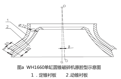 如圖a 所示,為WH1660單缸圓錐碎石機原粉碎型腔的示意簡圖。形成粉碎腔型的兩個零件分別是不變襯板(1)及動錐襯板(2)。不變襯板的內側曲面與動錐襯板的外側曲面所夾的環(huán)形空間即為粉碎型腔。