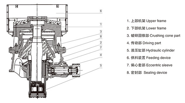 圓錐式礦山碎石機(jī):在操作過程當(dāng)中,電機(jī)通過驅(qū)動系統(tǒng)驅(qū)動偏心套操作,動錐在偏心軸套的迫動下做操作擺動,動錐挨近靜錐的區(qū)段即成為機(jī)腔,石頭獲得動錐和靜錐的多次擠壓和抨擊而破碎,動錐離開該區(qū)段時,該處已破碎到要求粒度的石頭在本身重力影響下下落,從錐底排出。