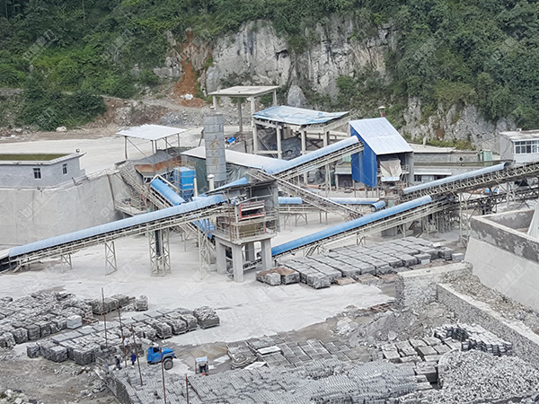 花崗巖原料經(jīng)振動(dòng)給料機(jī)均勻給料,進(jìn)入液壓顎式破碎機(jī)進(jìn)行粗破,然后進(jìn)入液壓圓錐破碎機(jī)進(jìn)行二破,二破出來的石料用振動(dòng)篩進(jìn)行篩分,返料進(jìn)入二破,小于150mm成品料進(jìn)入另外的液壓圓錐破碎機(jī)進(jìn)行三段破碎,大于40mm進(jìn)入液壓圓錐破碎機(jī)再次破碎,小于40mm的進(jìn)入沖擊式破碎機(jī)整形,成品出0-5mm,5-10mm,10-20mm,20-31.5mm的骨料,該生產(chǎn)線產(chǎn)量大、粒型好。